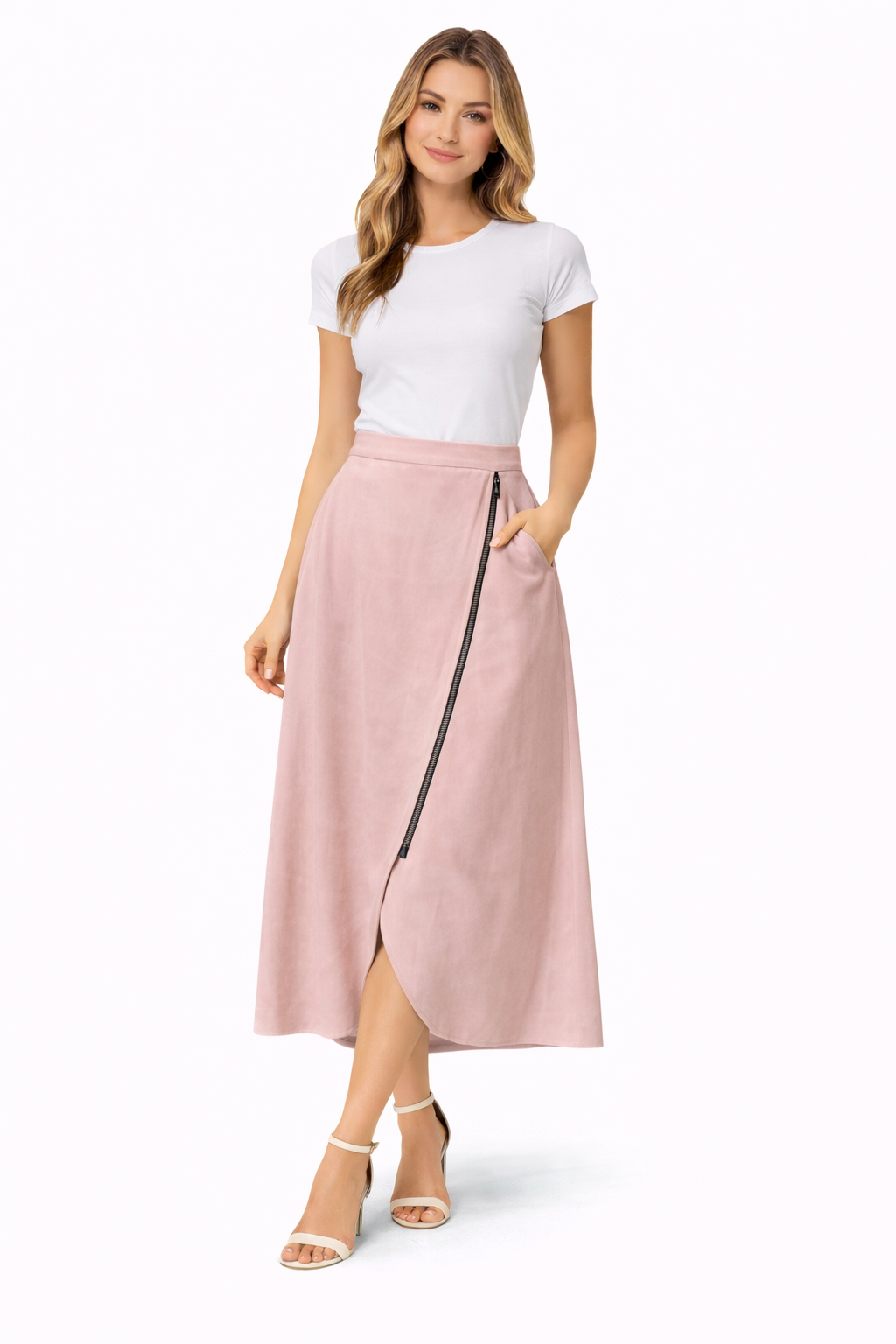 Hardware & Details: * Exposed Zipper: A prominent black diagonal zipper runs from the waist down the left thigh, serving as both a functional closure and a bold edgy contrast to the soft pink fabric.