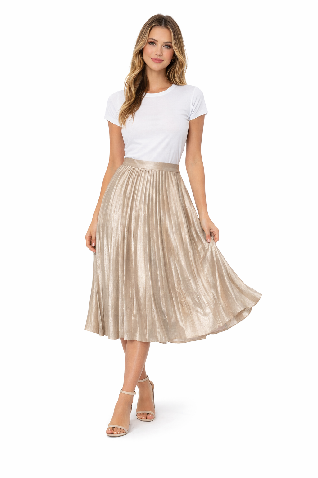 Add a touch of radiant elegance to your wardrobe with this stunning champagne midi skirt. Featuring a shimmering metallic finish that catches the light with every movement, this piece is designed with delicate accordion pleats for a fluid, graceful silhouette. The high-waisted band provides a structured fit that flows effortlessly into a mid-calf length, making it a perfect choice for weddings, holiday parties, or elevated brunch looks.