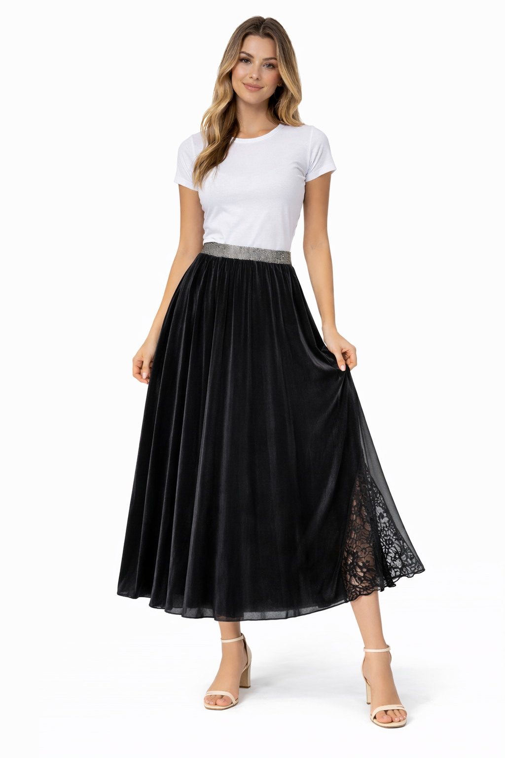 Elevate your evening look with a touch of texture and romance. This stunning midi skirt is crafted from ultra-soft, shimmering black velvet that drapes beautifully for a flattering, flowy silhouette. Designed to transition effortlessly from dinner parties to holiday events, it features a striking sheer lace insert on the side that adds an unexpected, feminine flair.