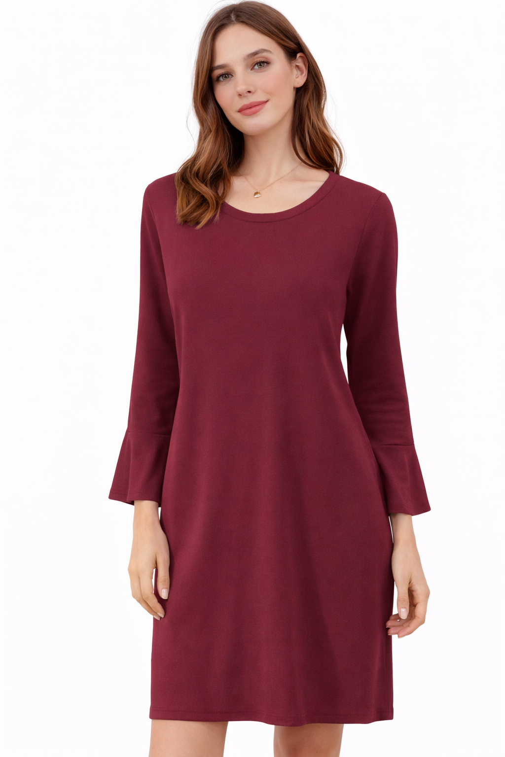 Women’s Long Sleeve Bell Cuff Shift Dress – Burgundy